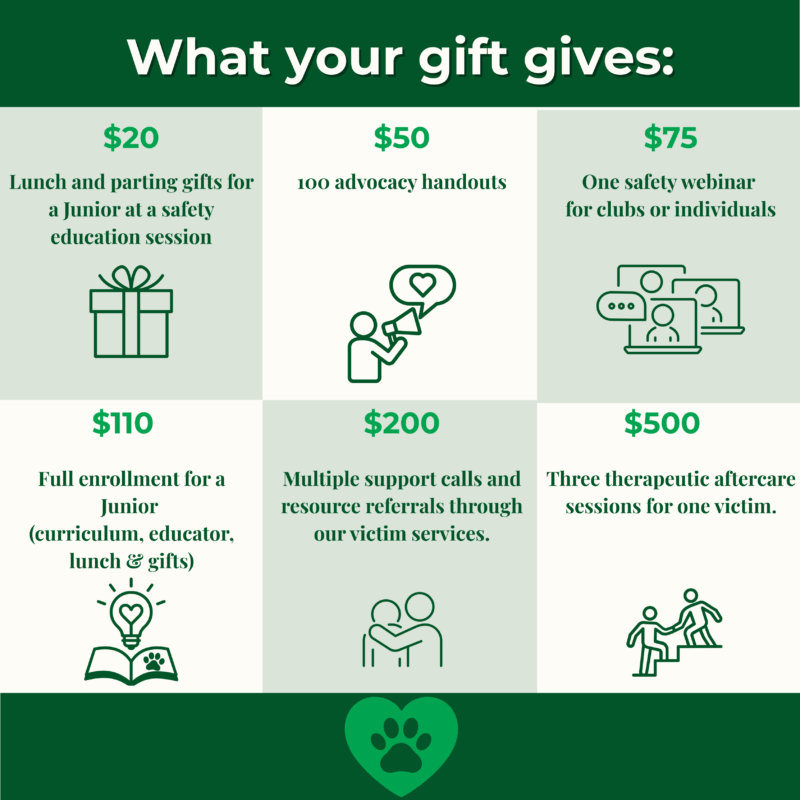 Think of your gift as more than an entry—it’s a lifeline. With just $5, you’re helping juniors learn how to stay safe while securing your spot in the Season of Safety Sweepstakes. When you give, you’re standing shoulder-to-shoulder with those who deserve safer spaces.
